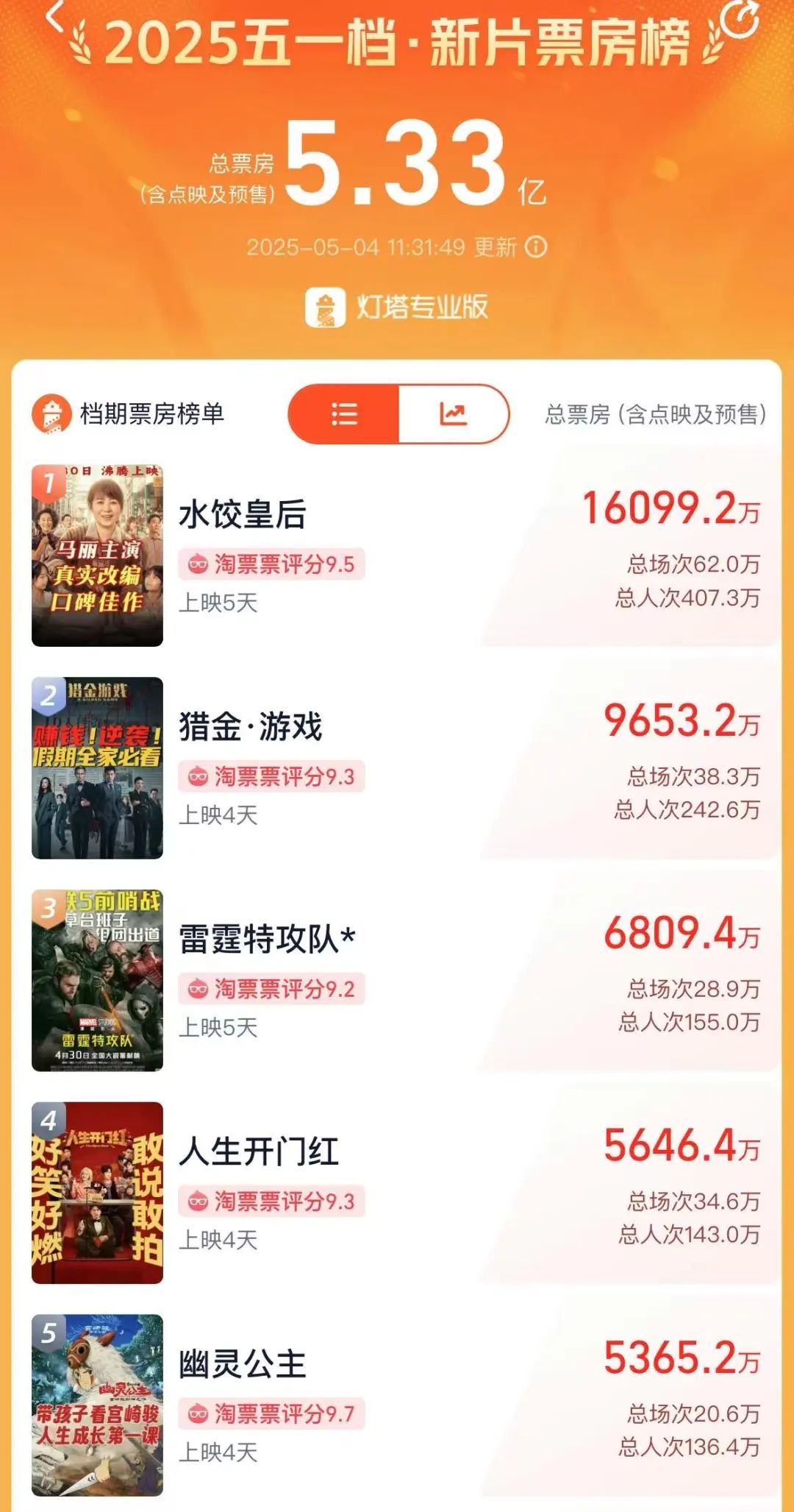 据灯塔专业版,截至5月4日11时30分,2025年五一档(5月1日—5月5日)档期内总票房(含点映及预售)达5.33亿元,影片《水饺皇后》《猎金·游戏》《雷霆特工队》暂列前三名,其中《水饺皇后》票房超1.6亿元。