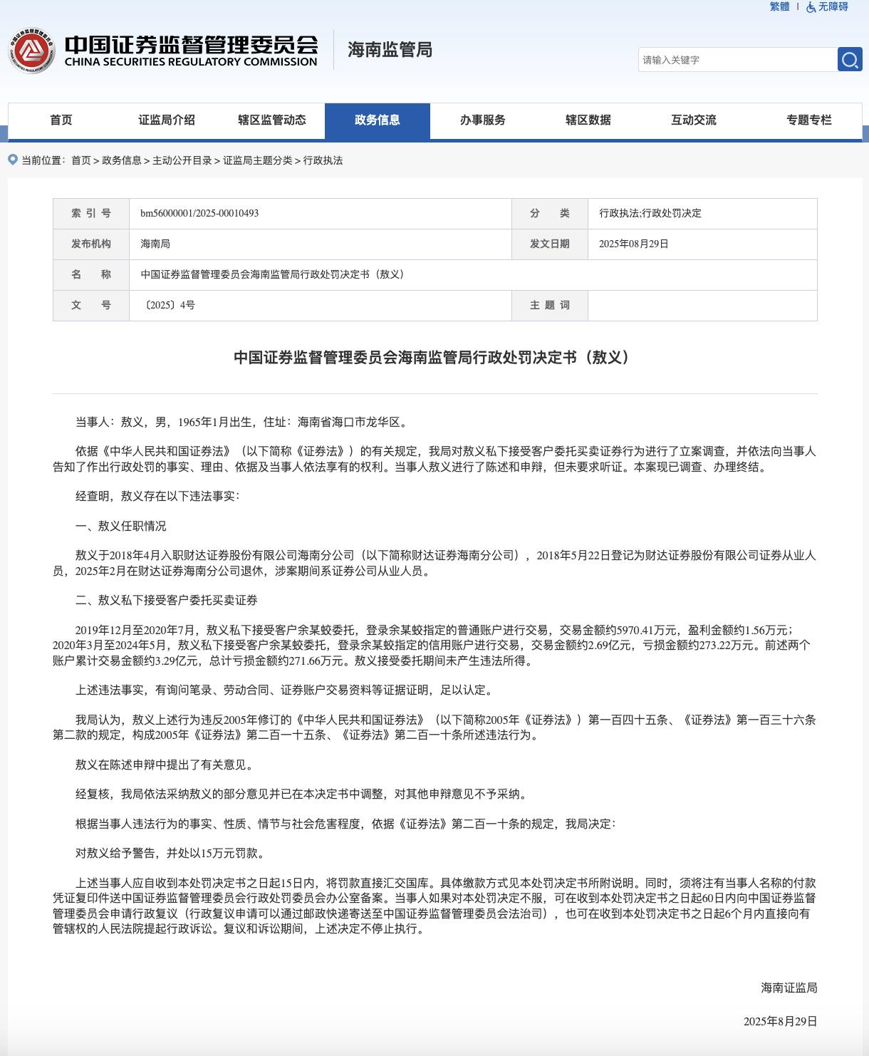9月5日,海南证监局公布对财达证券海南分公司前负责人敖义的行政处罚决定书。这位已退休的券商老总因私下接受客户委托买卖证券,被给予警告并处以15万元罚款。
