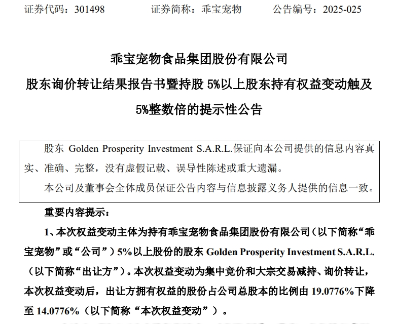 6月13日,乖宝宠物(301498)发布公告,股东Golden Prosperity Investment S.A.R.L.通过询价转让方式减持1200万股,转让价格为90元/股,交易总金额达到10.8亿元。