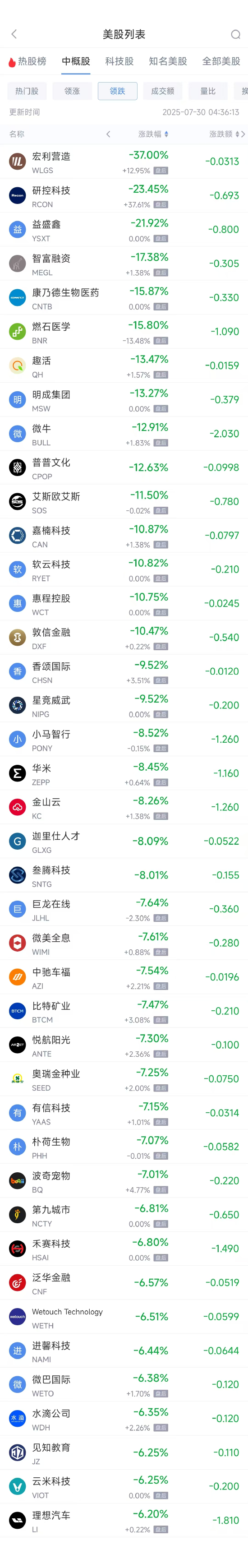 领跌中概股列表: