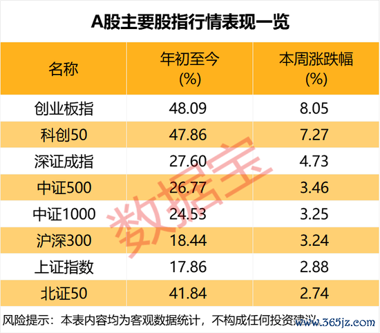 本周(10月20日至24日),A股市场单边上行,市场成交规模维持在1.6万亿元上方。指数方面,上证指数一周上涨2.88%,最新报3950.31点,为年内新高。深证成指大涨4.73%,创业板指飙涨8.05%,为周涨幅最高的A股主要指数。