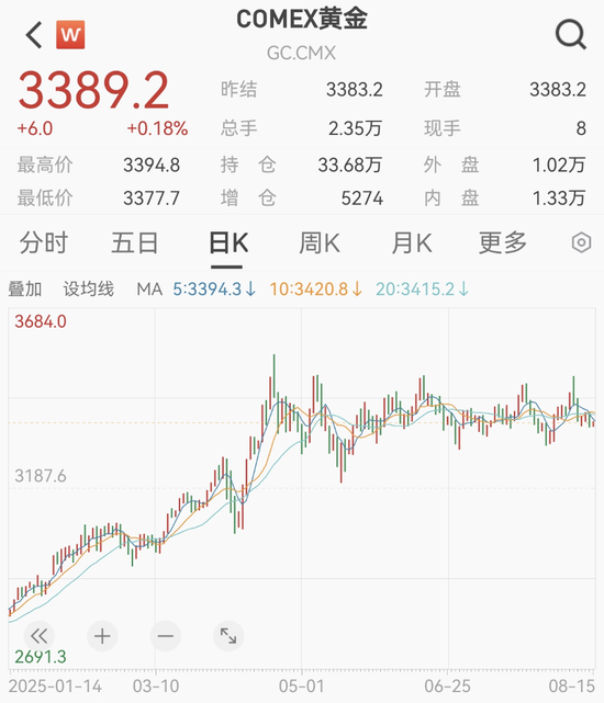 今年以来,国际金价节节攀升。进入8月以来,COMEX黄金价格一度冲破3500美元/盎司大关。不过,近期金价有所回落,目前COMEX黄金在3390美元/盎司附近徘徊。