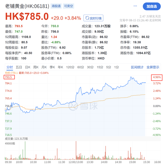 提价消息公布后,8月15日午后,港股老铺黄金股价抬升,盘中涨幅一度接近5%。