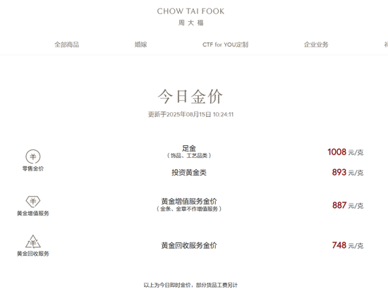 虽然短期走低,但国际金价仍处于近年来高位水平。黄金饰品方面,8月15日,周大福足金饰品价格为1008元/克,周生生为1003元/克,六福珠宝、谢瑞麟、潮宏基、老凤祥等品牌金饰价格也在1000元/克以上。
